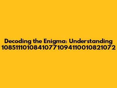 Ever stumbled upon a sequence of numbers that just seems to pop up everywhere, leaving you scratching your head? Well, let's talk about 10851110108410771094110010821072. It might look like a random string of digits, but often, these kinds of sequences hold a particular significance depending on the context in which they appear. In this article, we'll try to break down what this number could mean, where you might encounter it, and how to interpret it. Whether it's an ID number, a code, or part of a more extensive system, understanding its potential origins can shed light on its purpose. So, stick around as we unravel the mystery behind this numeric sequence and give you a clearer picture of its potential applications. Understanding number sequences like these requires a bit of detective work. First, consider where you found the number. Was it in a database, on a product, or in some kind of official document? This context is crucial because it gives you a starting point for your investigation. If it's part of a product code, you might be able to look up the manufacturer's coding system. If it's in a database, it could be a primary key, a foreign key, or some other kind of identifier. If you're dealing with a website or an application, the number could be part of a URL or a session ID. Each of these possibilities calls for a different approach to deciphering its meaning. Don't be afraid to experiment with different search terms and research methods. You might be surprised at what you uncover.